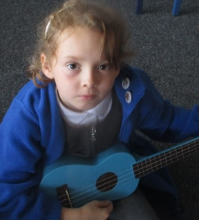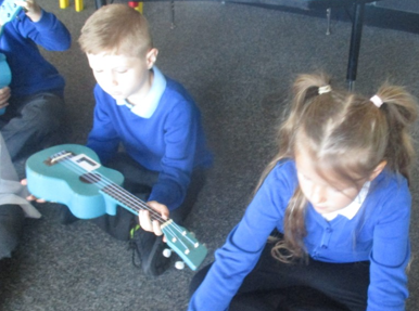 In music we have been learning the ukulele, learning to strum and pluck. We used a plectrum to help us too, we have learnt chords such as baby f and c.